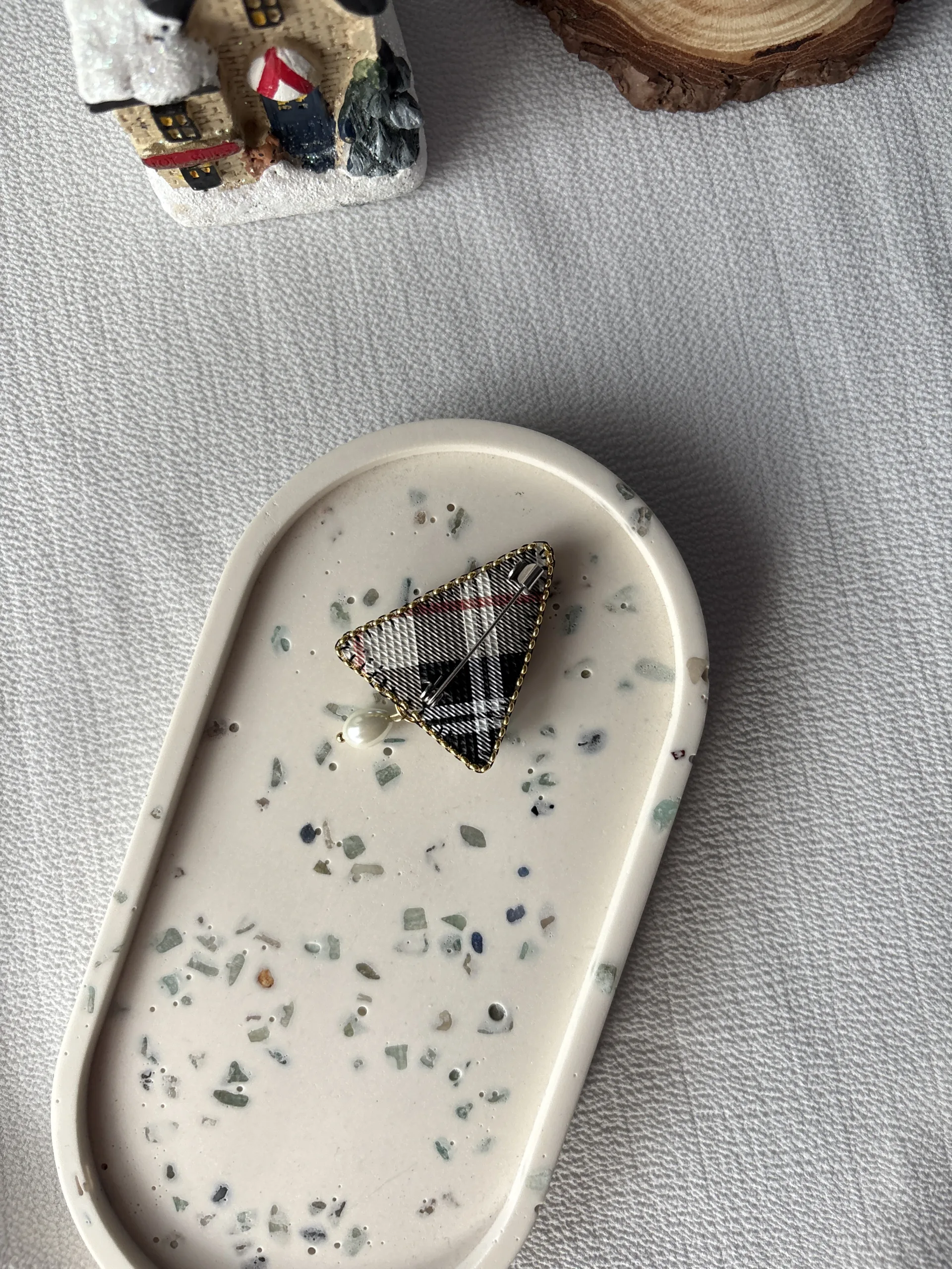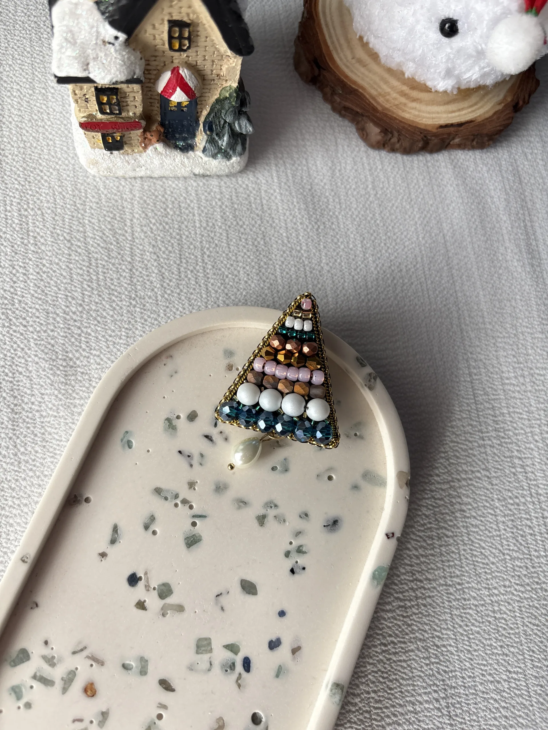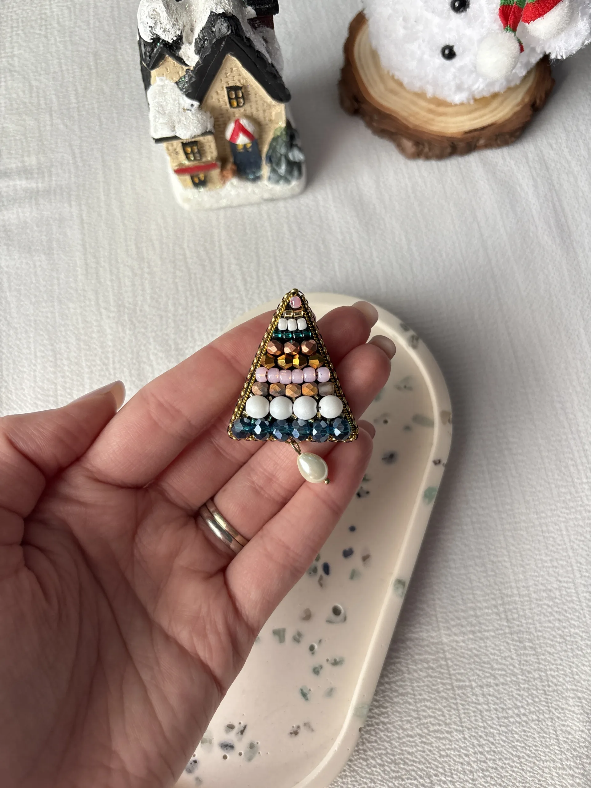 Materiale: fetru, cristale sticlă, perle sticlă, perle cechia, toho, șirag cristale sticlă, ac broșă oțel inoxidabil, piele ecologică