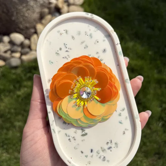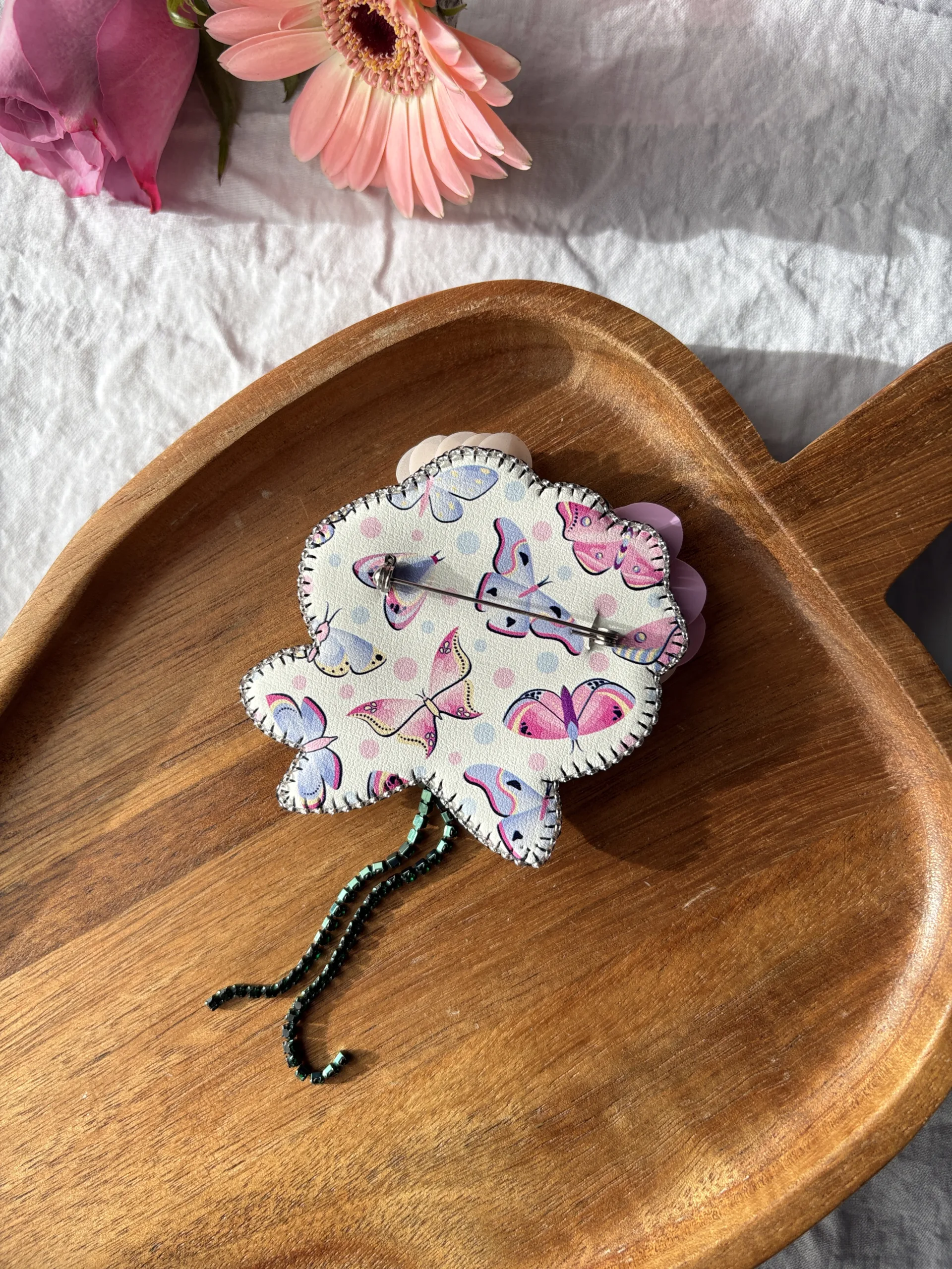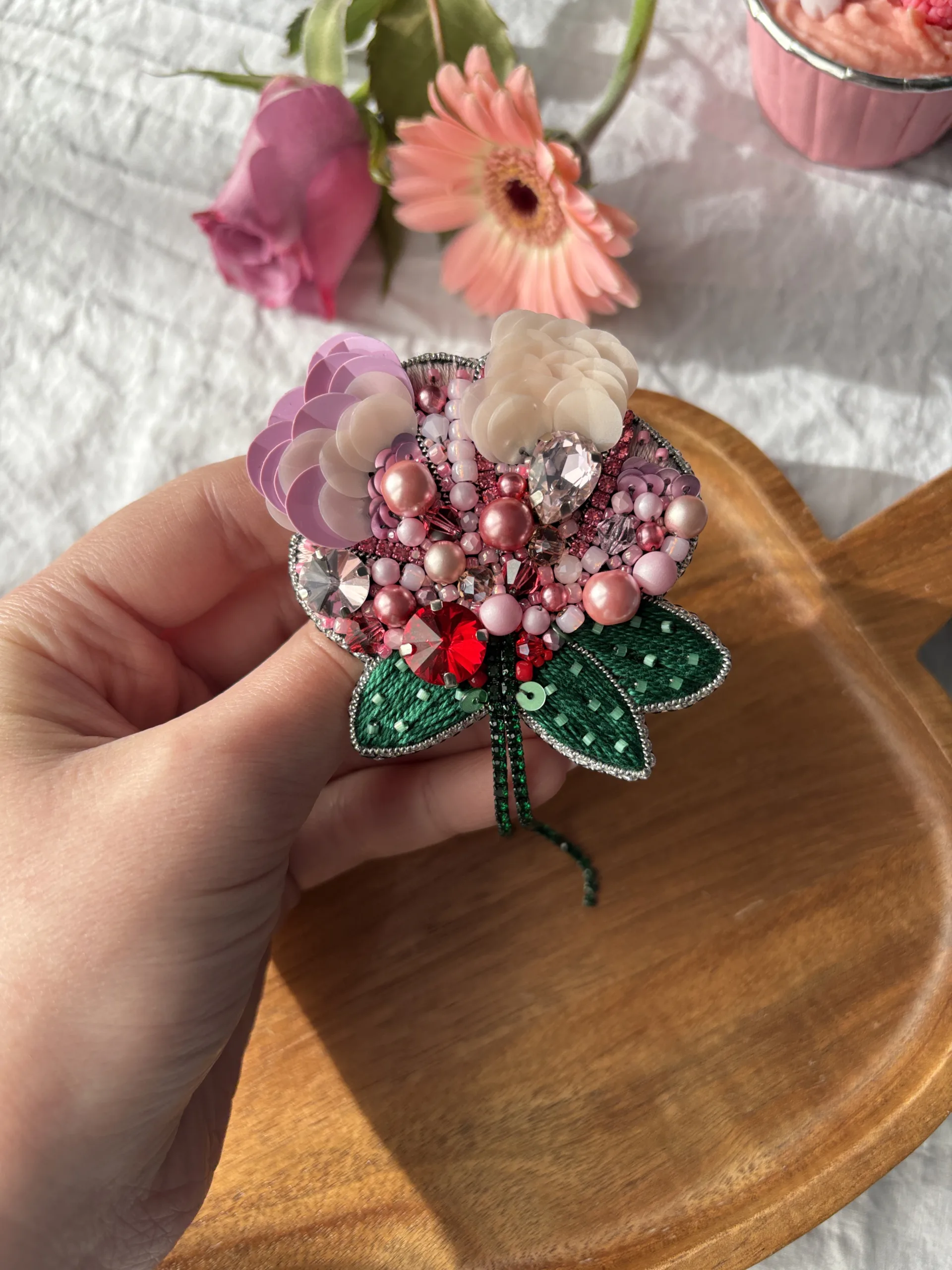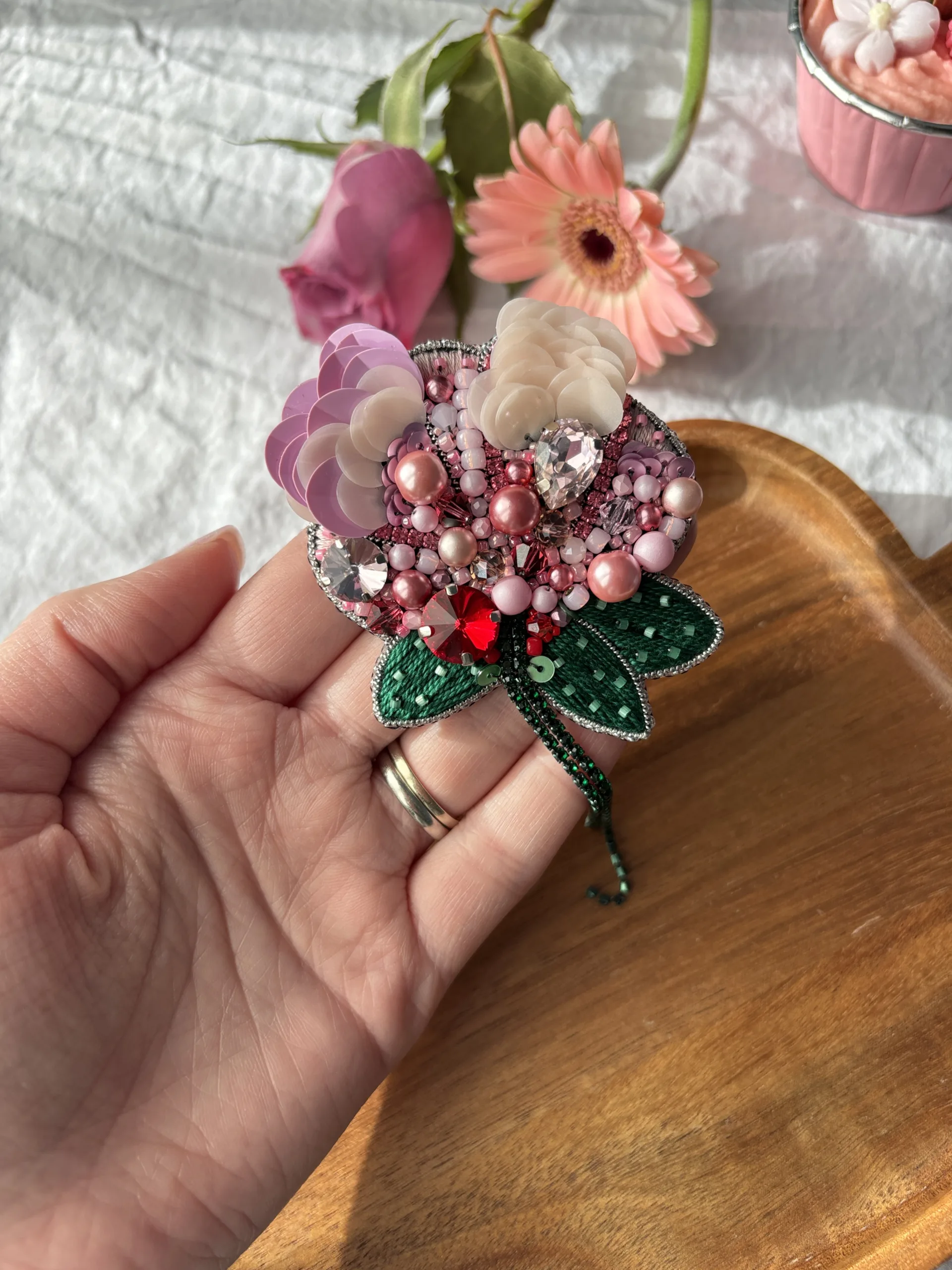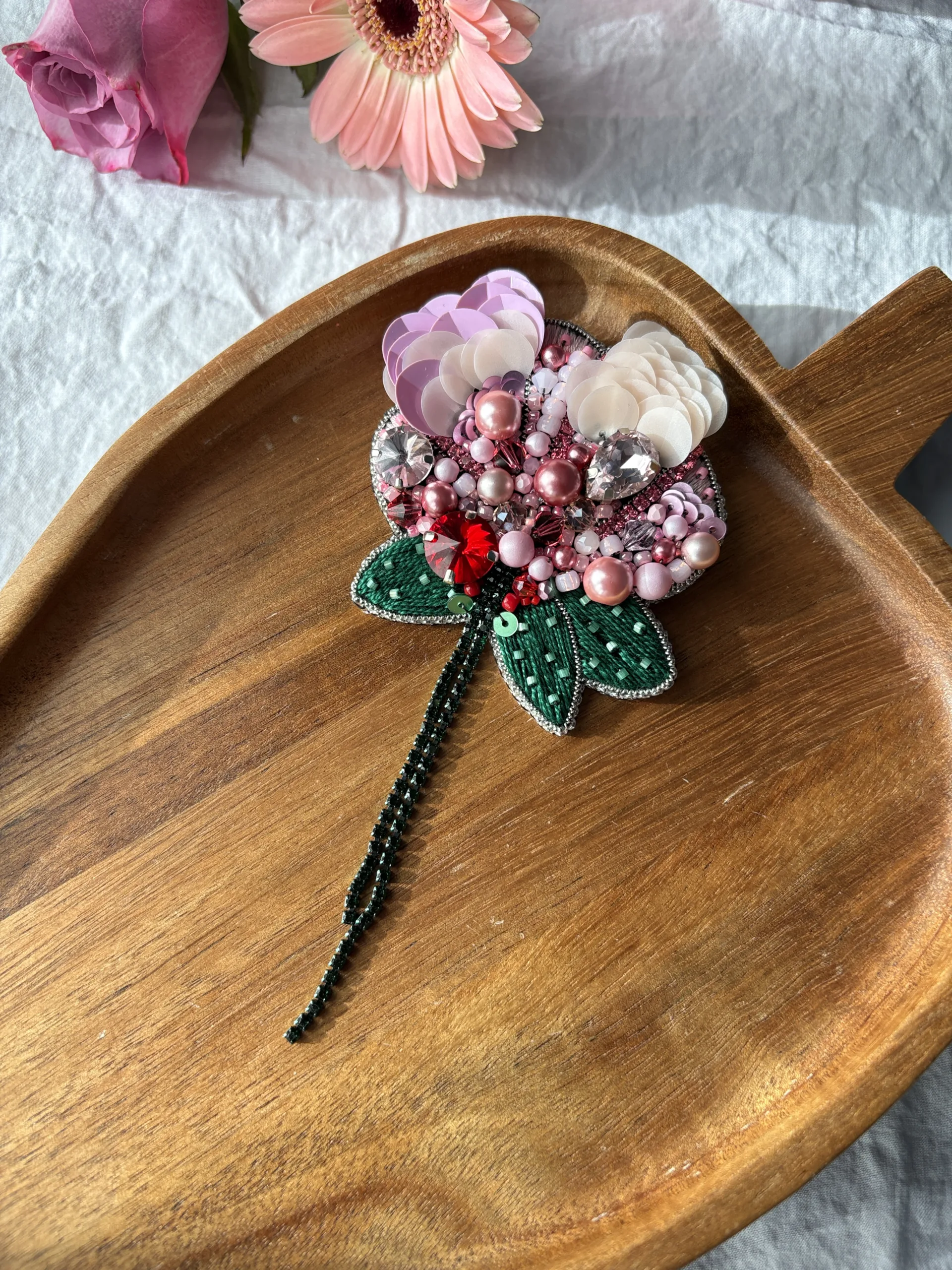Materiale: fetru, cristale sticlă, mărgele toho, perle de sticlă, fire polish, paiete, ac broșă din oțel inoxidabil, piele ecologică.Broșa vine împachetată într-o cutiuță personalizată.