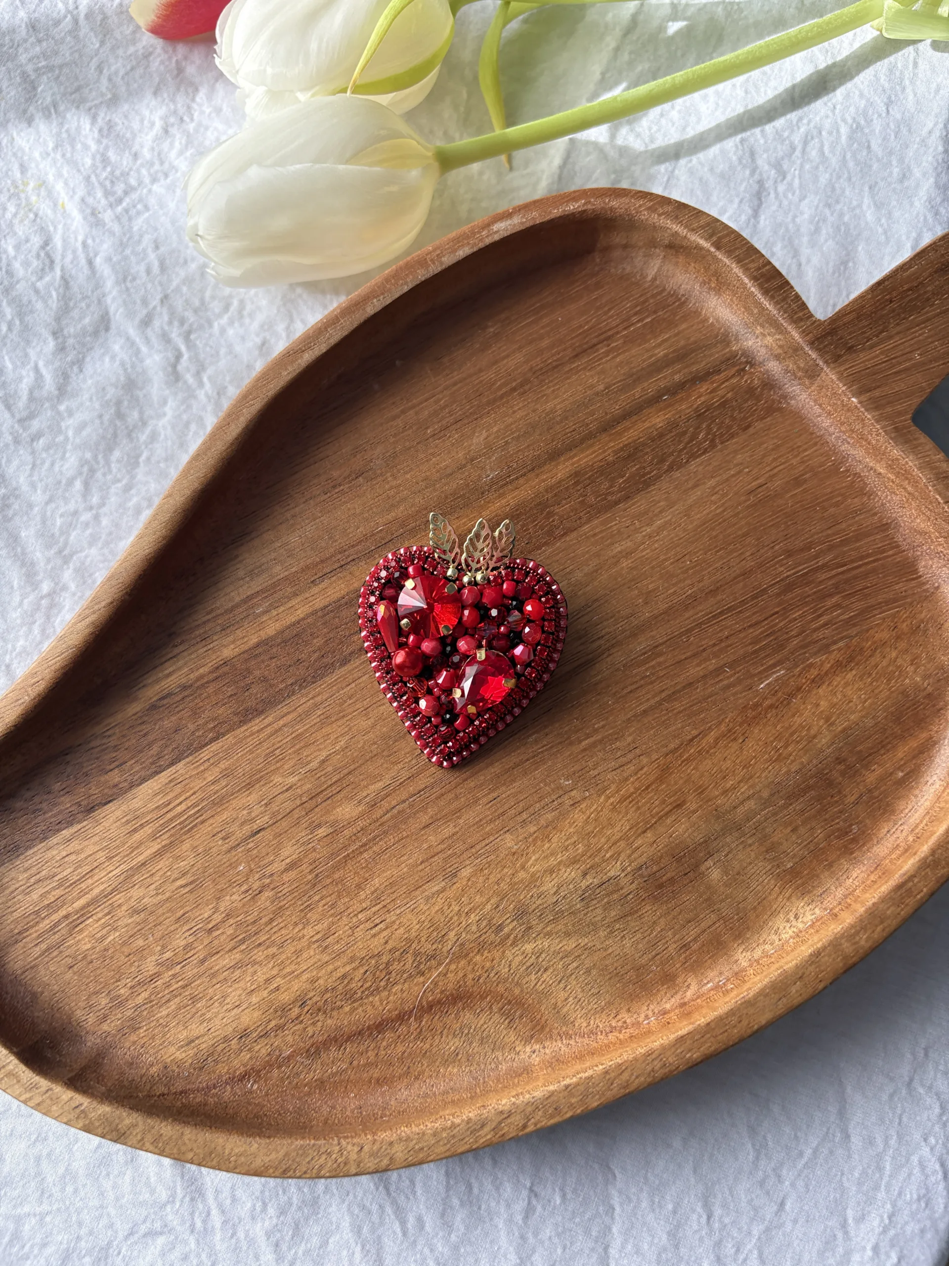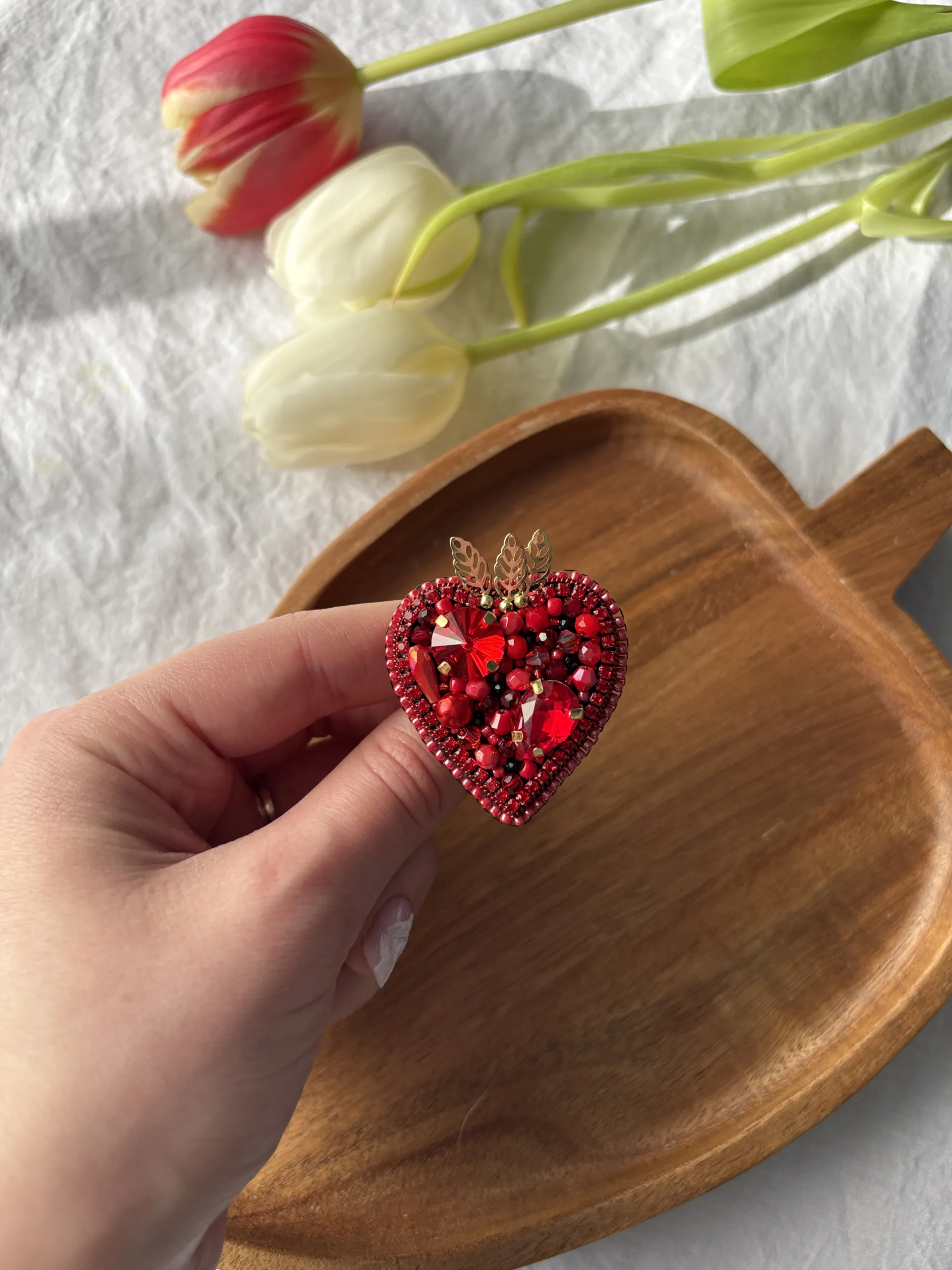 Materiale: fetru, cristale sticlă, mărgele toho, perle de sticlă, fire polish, frunze aurii din oțel inoxidabil, ac broșă din oțel inoxidabil, piele ecologică.Broșa vine împachetată într-un săculeț din satin și cutiuță personalizată.