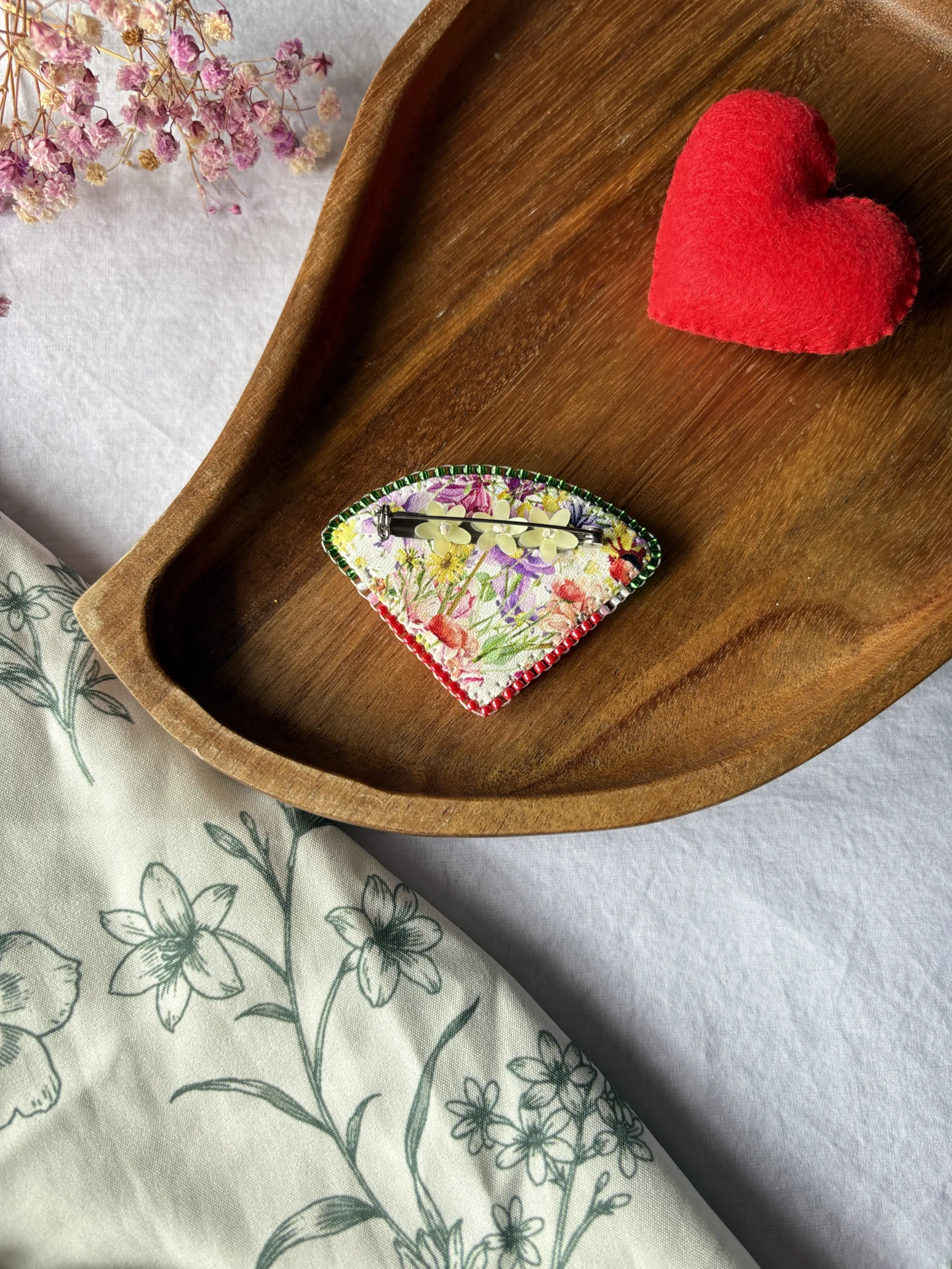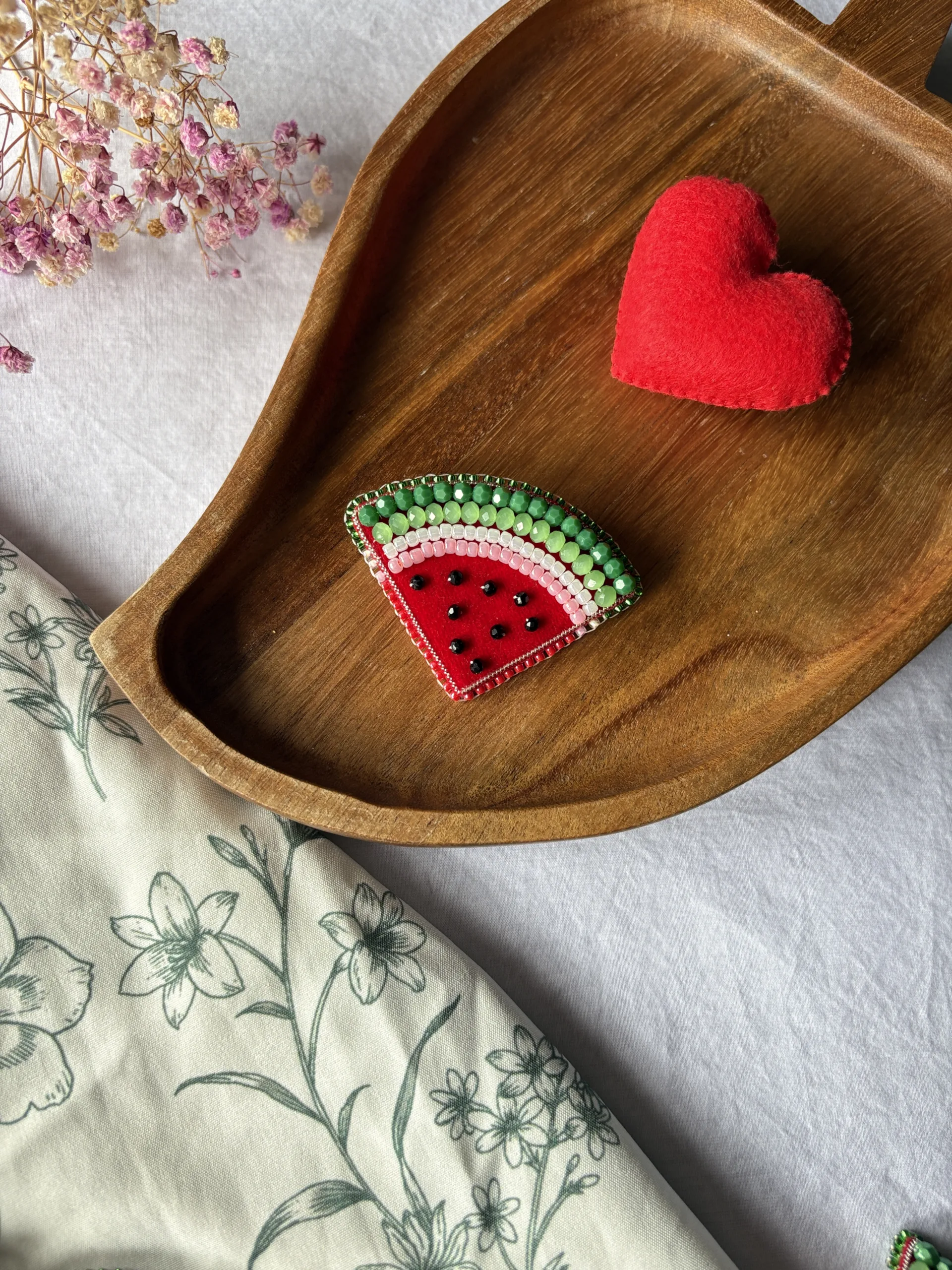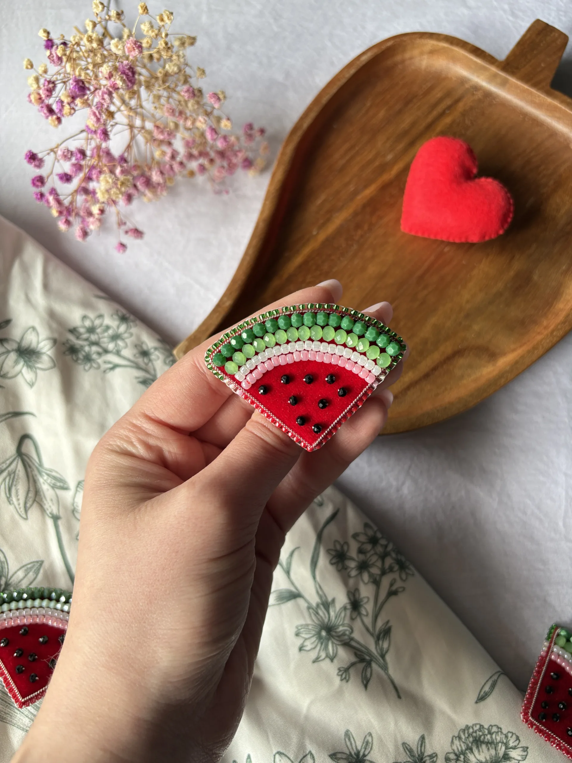 Broșa în formă de felie de pepene este confecționată din cristale de sticlă și mărgele Toho, meticulos cusute pe o bază de catifea roșie de o finețe aparte.