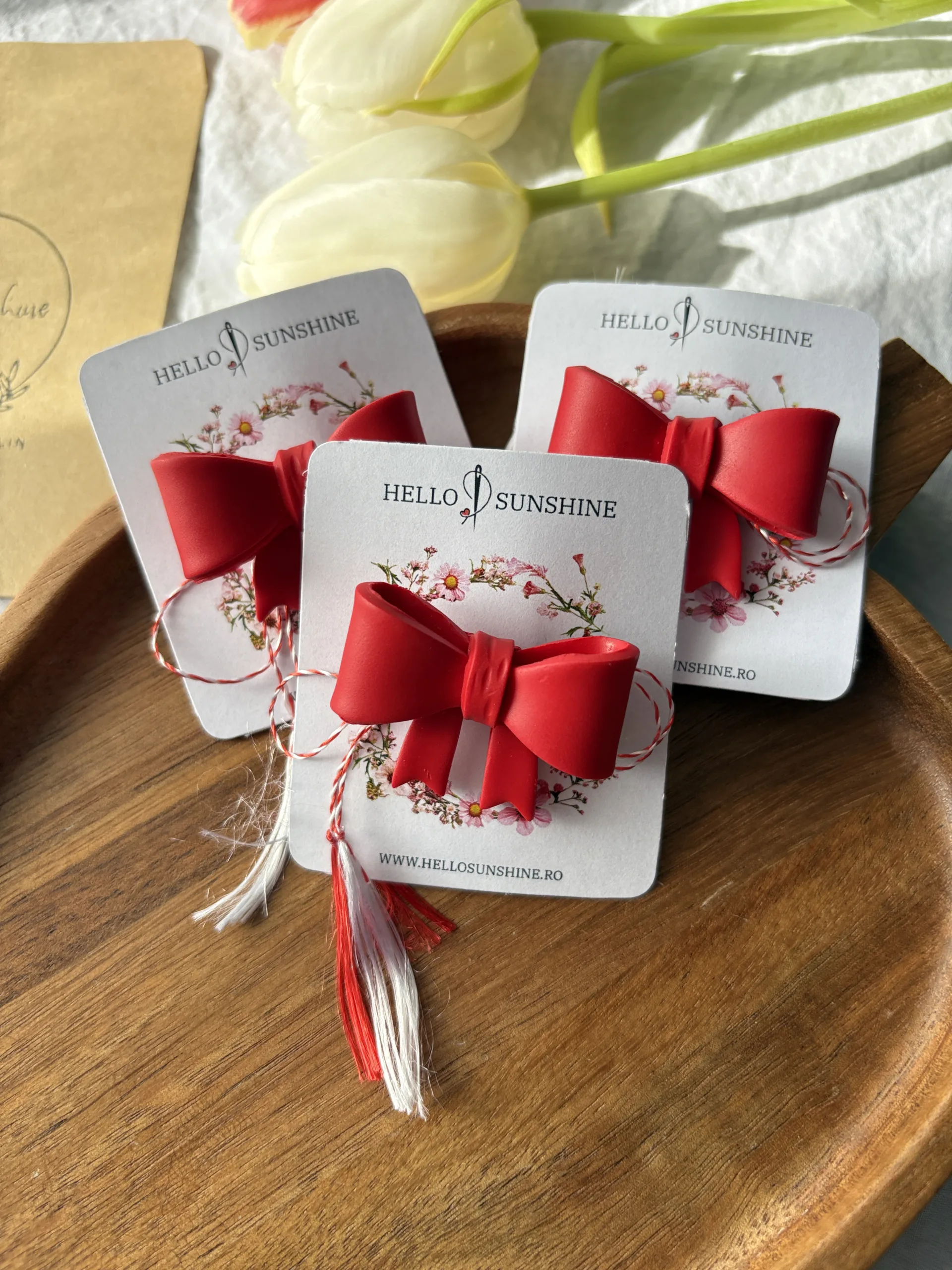 Materiale: Broșa este realizată manual din lut polimeric. Baza broșei este confecționată din metal comun, de aceea se recomandă evitarea contactului cu umiditatea.Bijuteria este montată pe un cartonaș cu șnur de mărțișor și ambalată într-un plic de hârtie cu logo și sticker special.