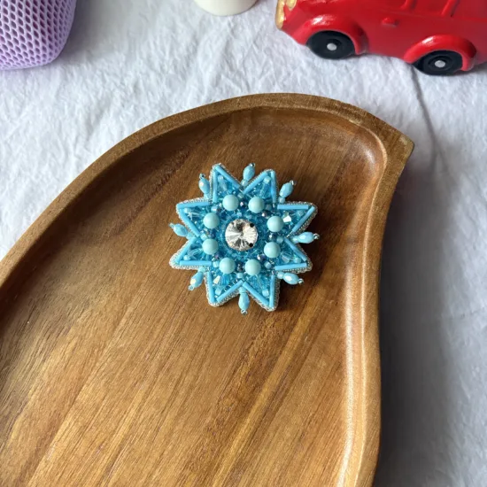 Materiale: fetru, perle sticlă, cristale stică, toho, șirag cristale sticlă, ac broșă oțel inoxidabil, piele ecologică
