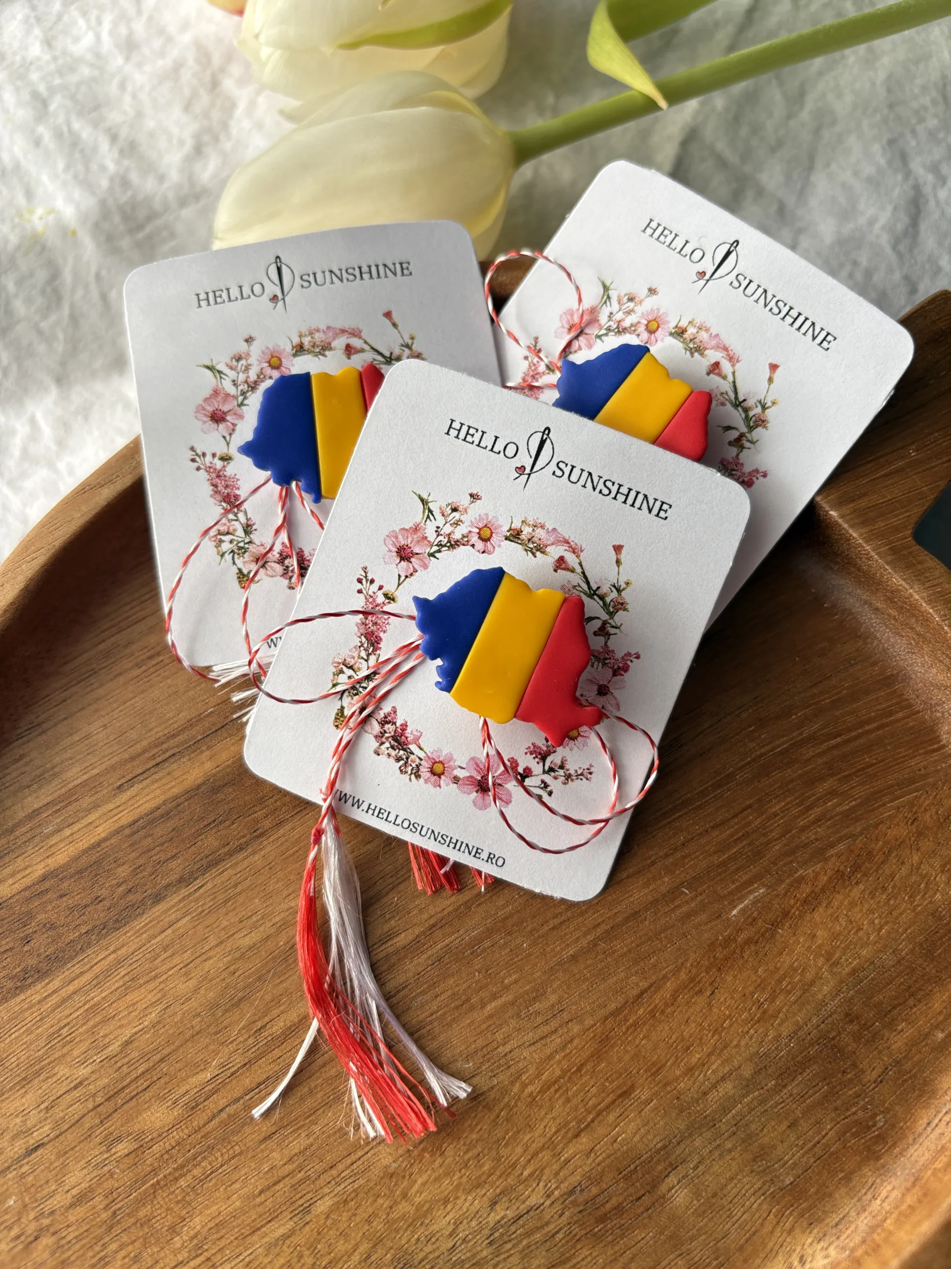 Materiale: Broșa este realizată manual din lut polimeric. Baza broșei este confecționată din metal comun, de aceea se recomandă evitarea contactului cu umiditatea.Bijuteria este montată pe un cartonaș cu șnur de mărțișor și ambalată într-o punguță transparentă din celofan.