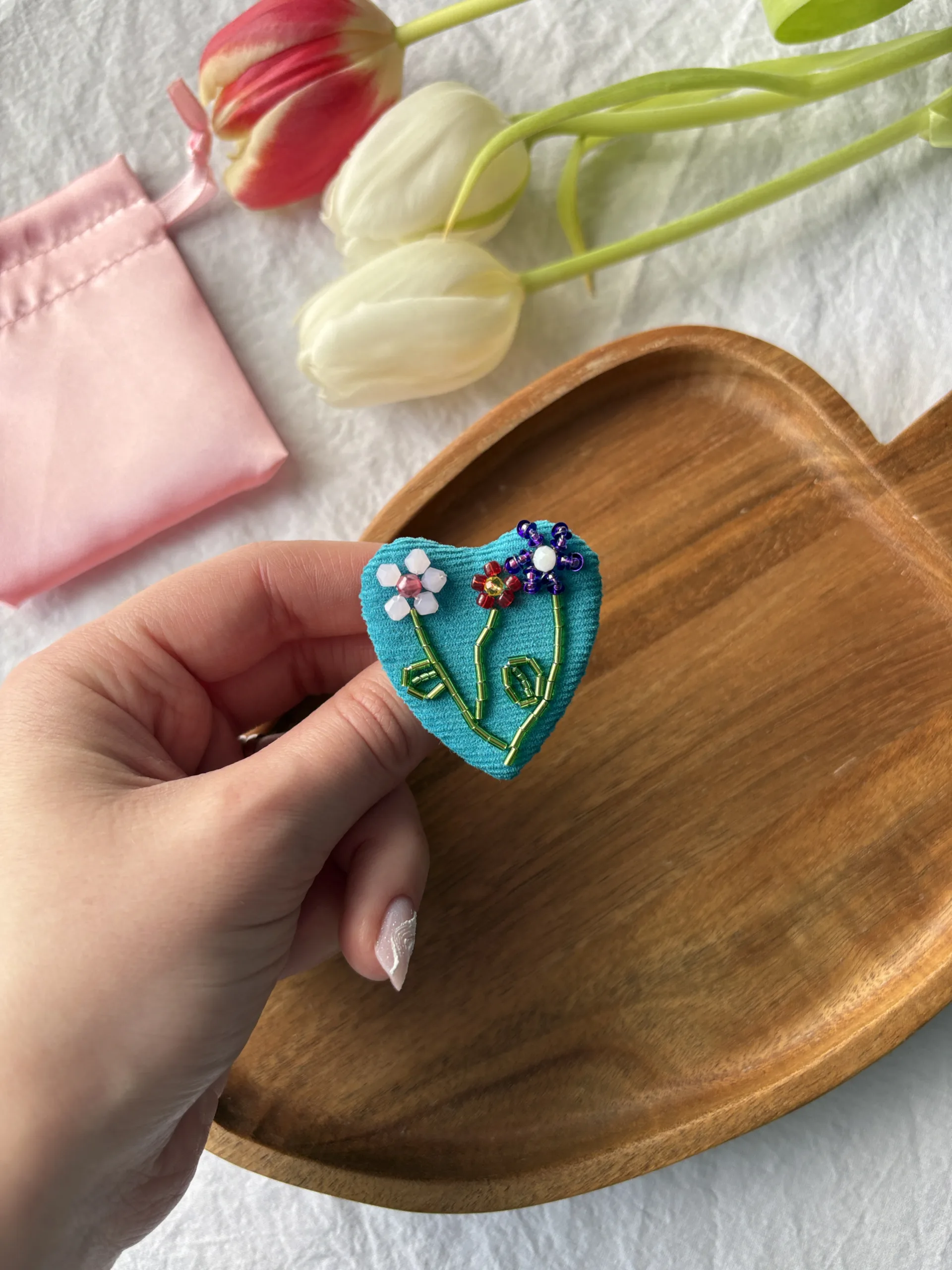 Materiale: catifea bumbac 100%, tuburi sticlă, paiete, cristale sticlă, mărgele toho 3mm, ac broșă din oțel inoxidabil. Broșa vine împachetată într-un săculeț din satin și cutiuță personalizată.
