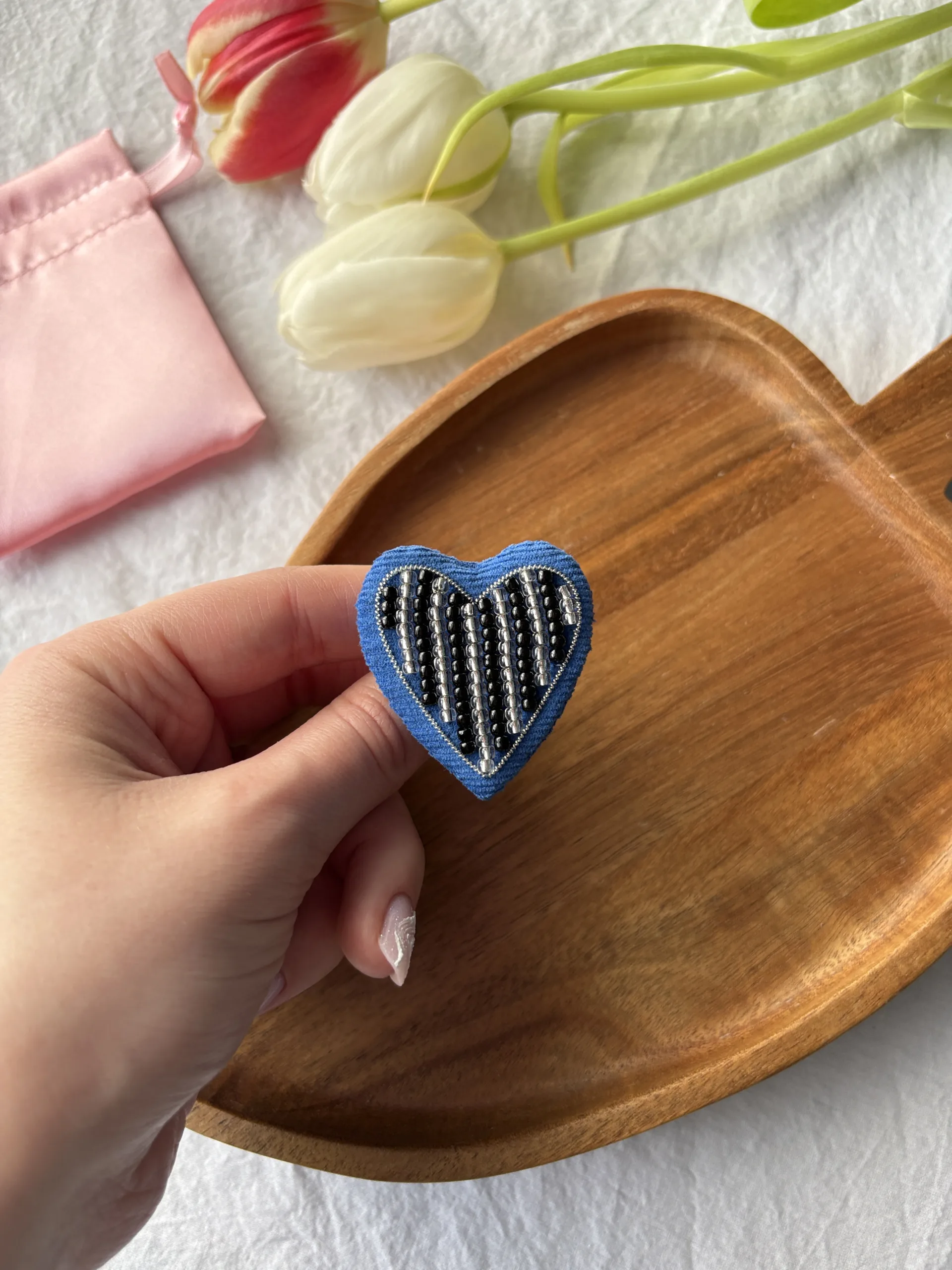 Materiale: catifea bumbac 100%, mărgele toho 3mm, ac broșă din oțel inoxidabil. Broșa vine împachetată într-un săculeț din satin și cutiuță personalizată.