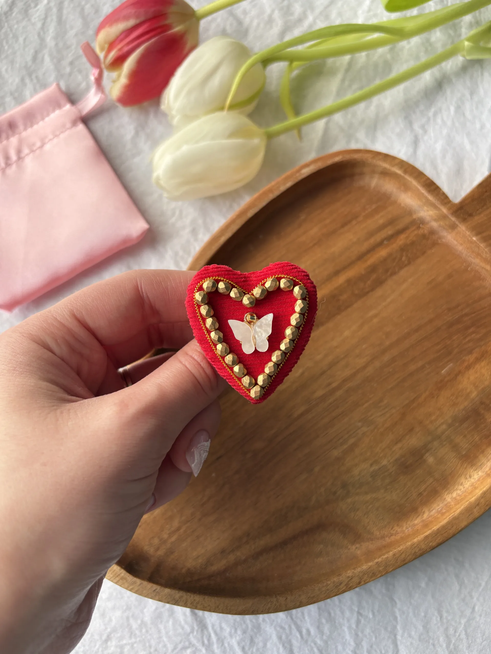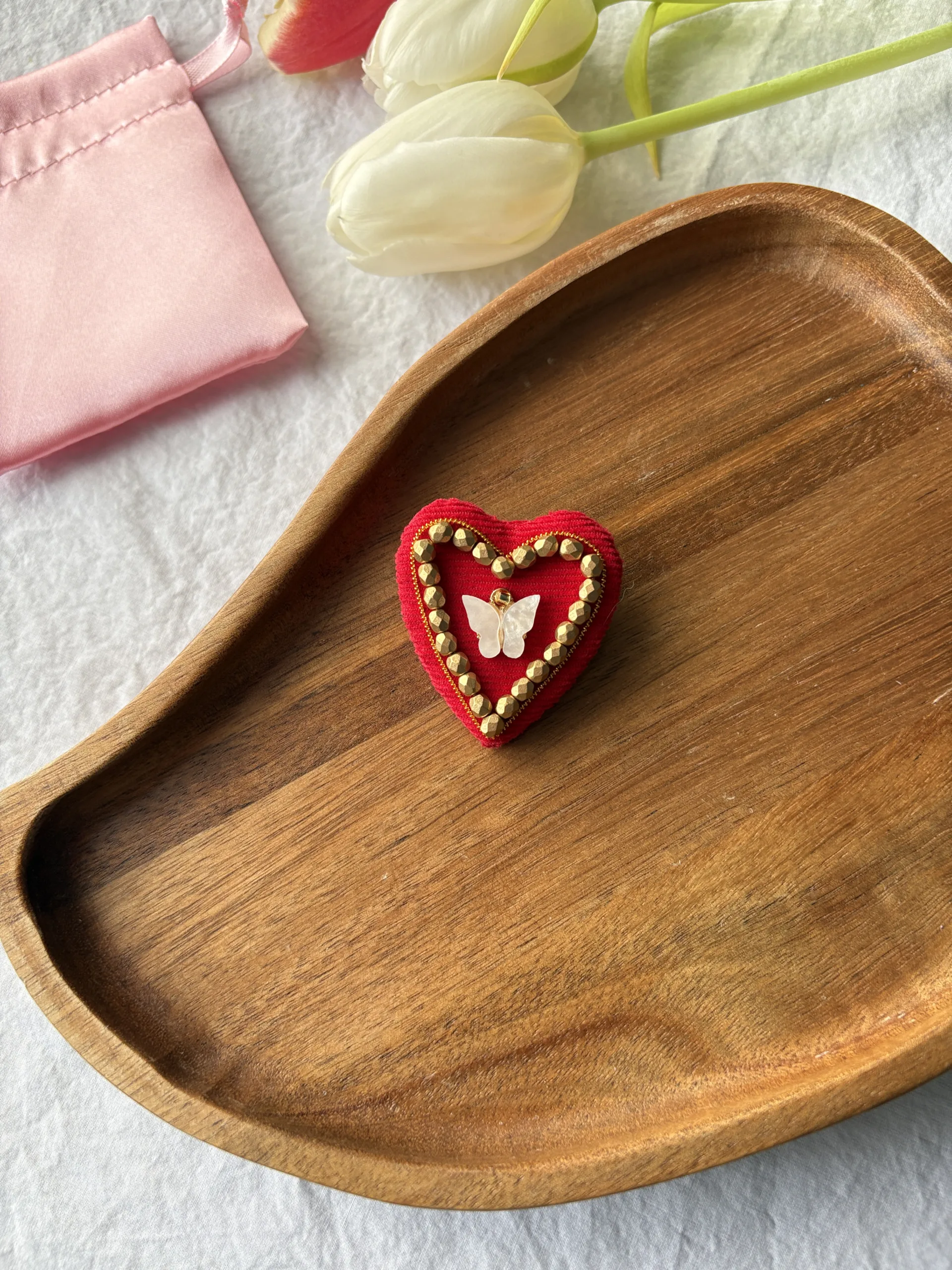 Materiale: catifea bumbac 100%, mărgele fire polish, pandantiv fluture, ac broșă din oțel inoxidabil. Broșa vine împachetată într-un săculeț din satin și cutiuță personalizată.