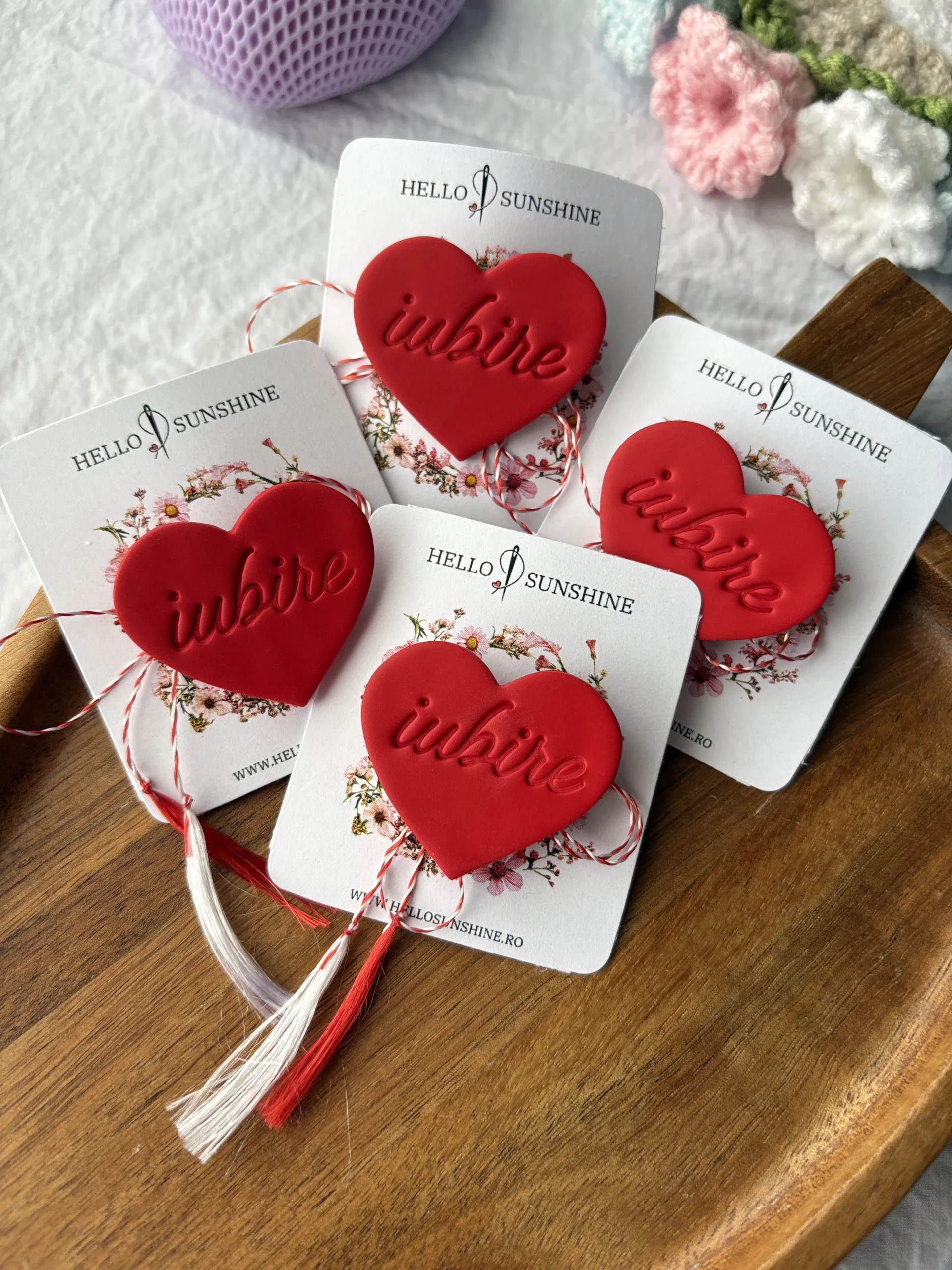 Materiale: Broșa este realizată manual din lut polimeric. Baza broșei este confecționată din metal comun, de aceea se recomandă evitarea contactului cu umiditatea.Bijuteria este montată pe un cartonaș cu șnur de mărțișor și ambalată într-o punguță transparentă din celofan.