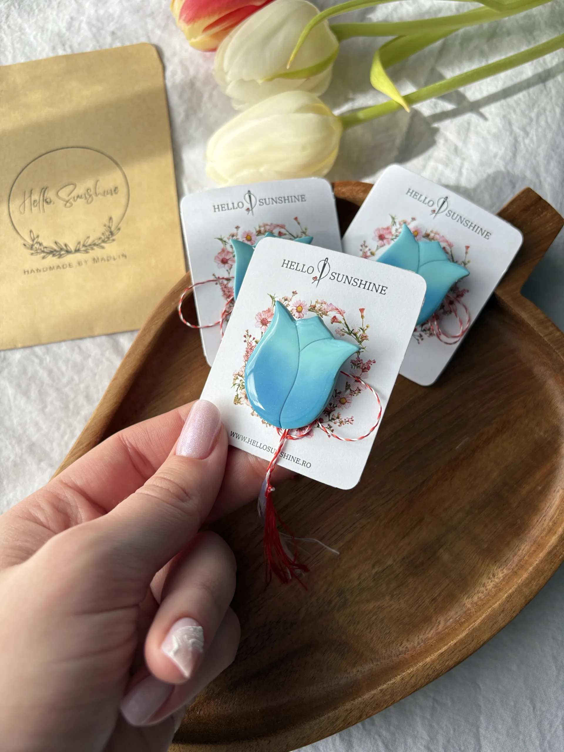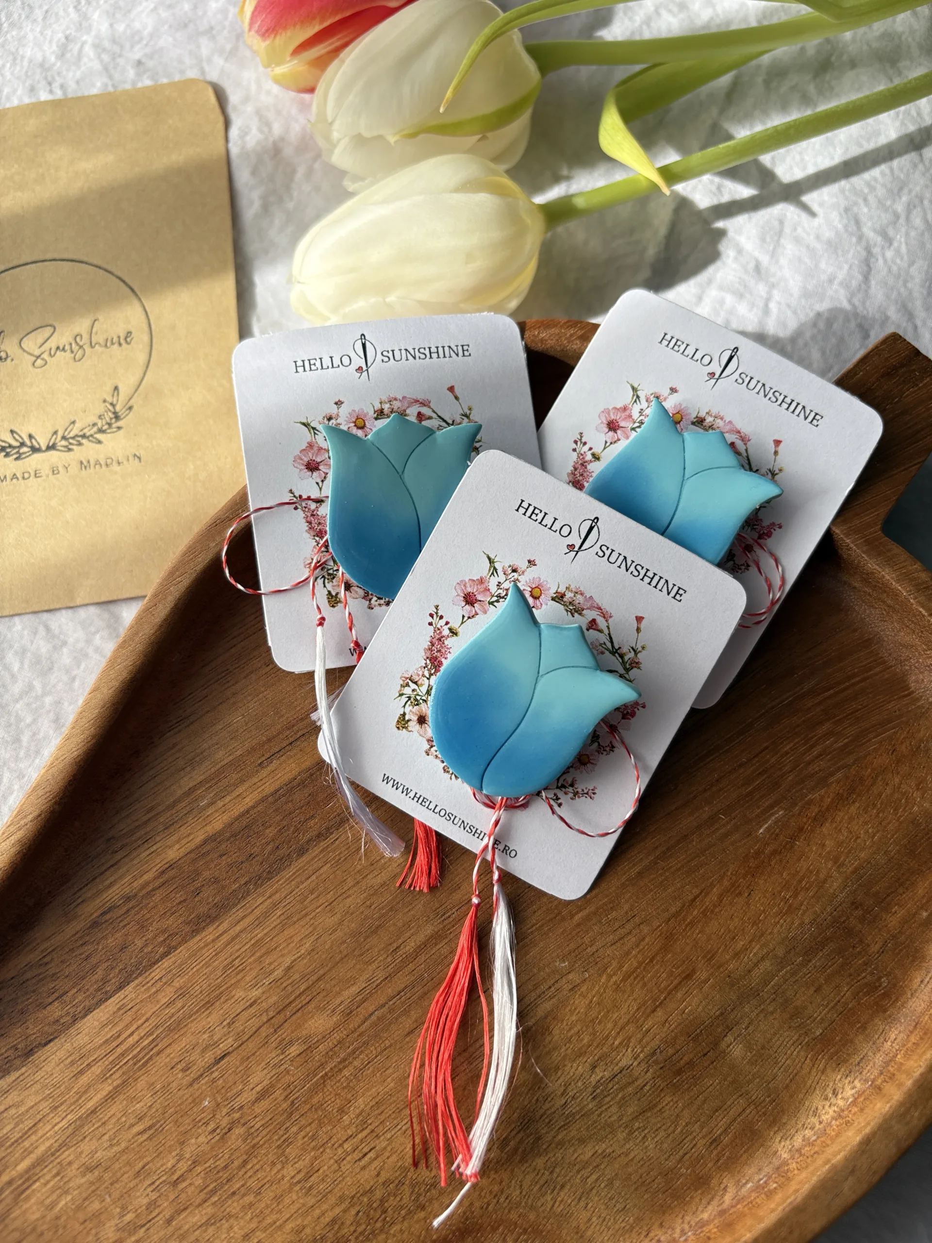 Materiale: Broșa este realizată manual din lut polimeric și are un strat de rășină uv. Baza broșei este confecționată din metal comun, de aceea se recomandă evitarea contactului cu umiditatea. Bijuteria este montată pe un cartonaș cu șnur de mărțișor și ambalată într-un plic de hârtie cu logo și sticker special.