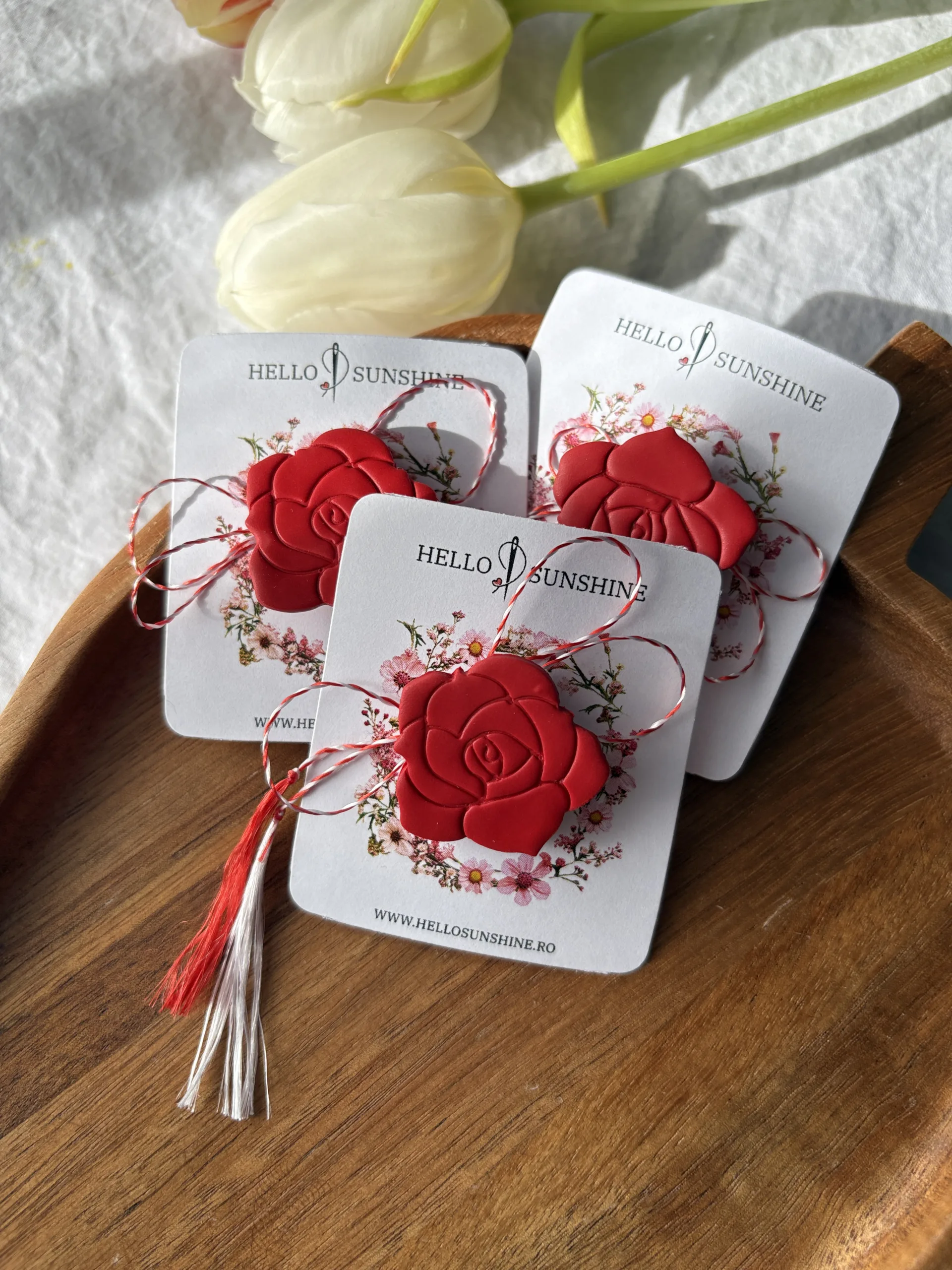 Materiale: Broșa este realizată manual din lut polimeric. Baza broșei este confecționată din metal comun, de aceea se recomandă evitarea contactului cu umiditatea.Bijuteria este montată pe un cartonaș cu șnur de mărțișor și ambalată într-o punguță transparentă din celofan.