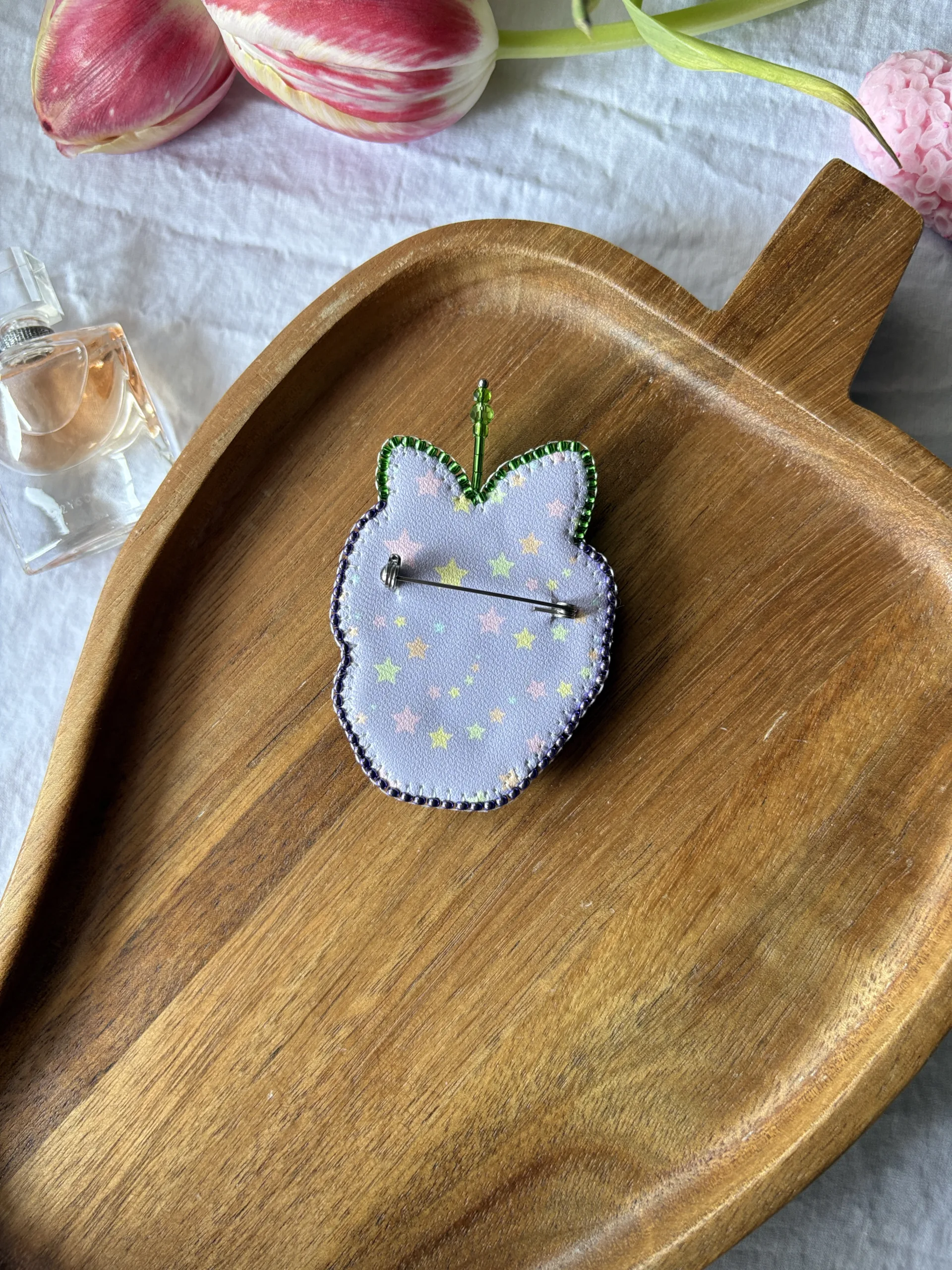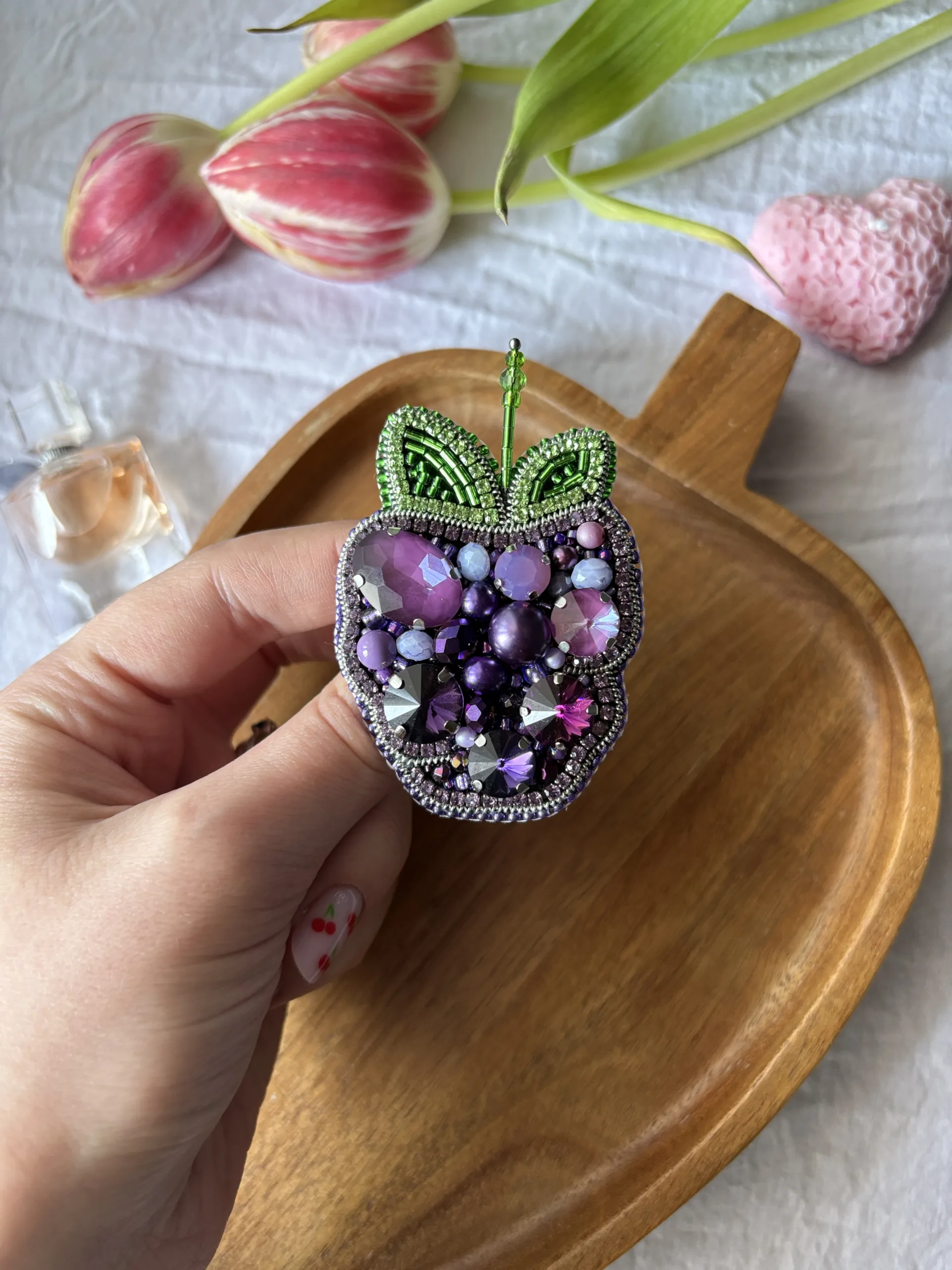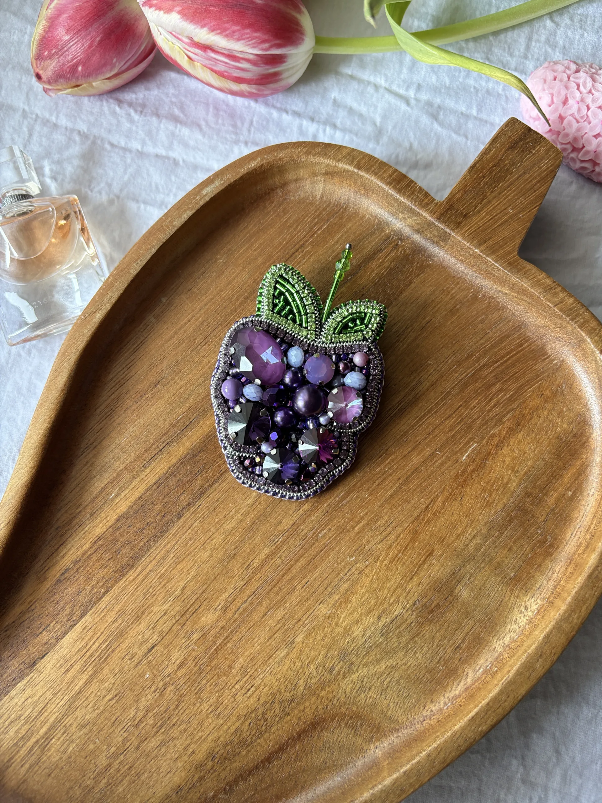 Materiale: fetru, cristale sticlă, mărgele toho, perle de sticlă, fire polish, ac broșă din oțel inoxidabil, piele ecologică.Broșa vine împachetată într-un săculeț din satin și cutiuță personalizată.