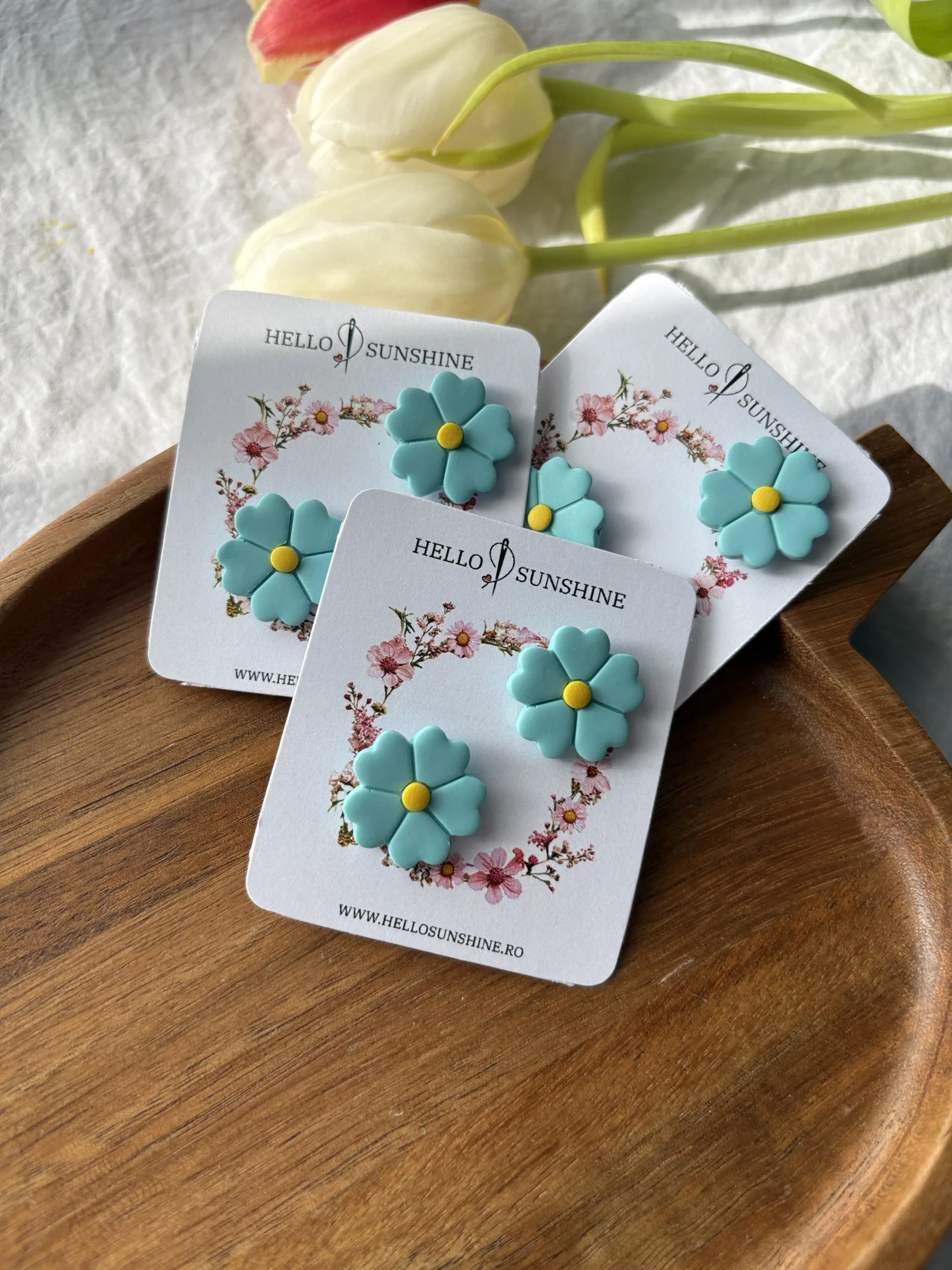 Materiale: Cerceii sunt realizați manual din lut polimeric. Baza cerceilor este confecționată din oțel inoxidabil. Bijuteria este montată pe un cartonaș și ambalată într-o punguță transparentă din celofan.