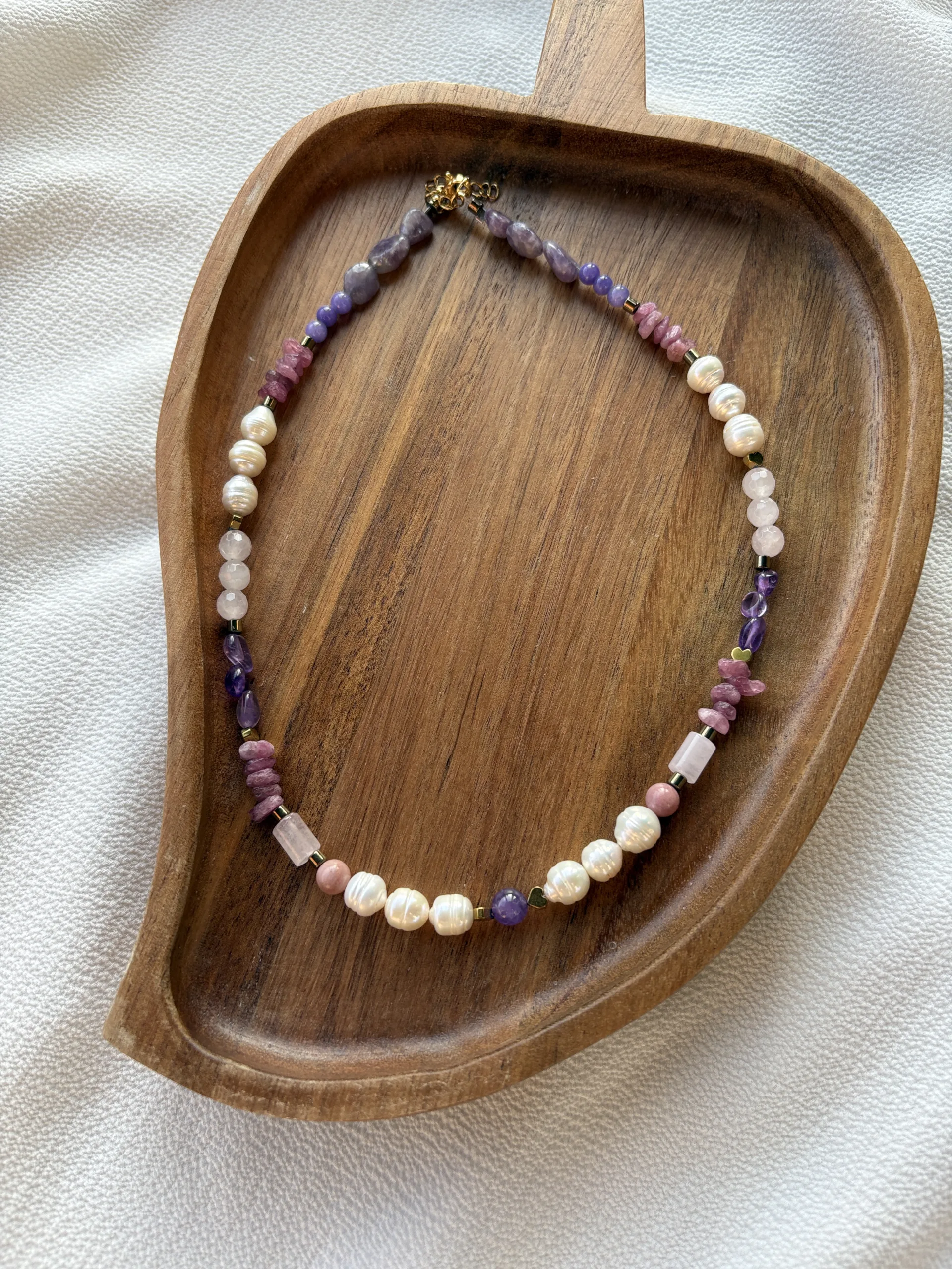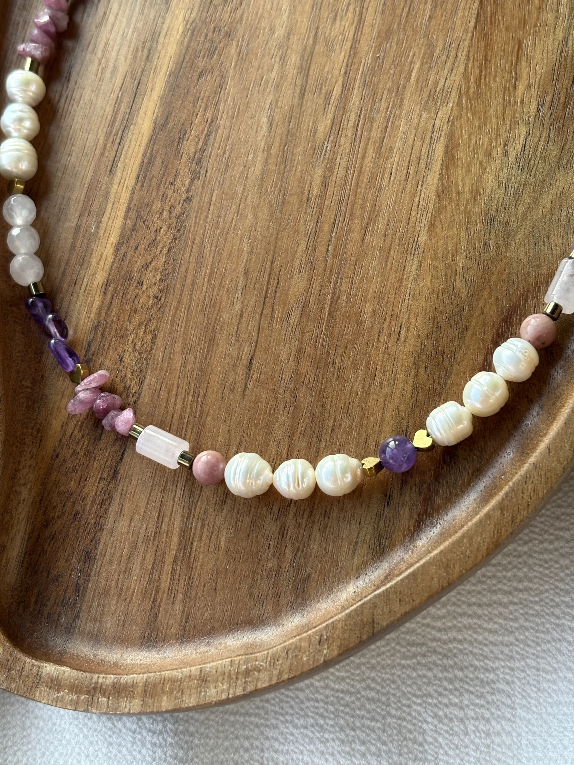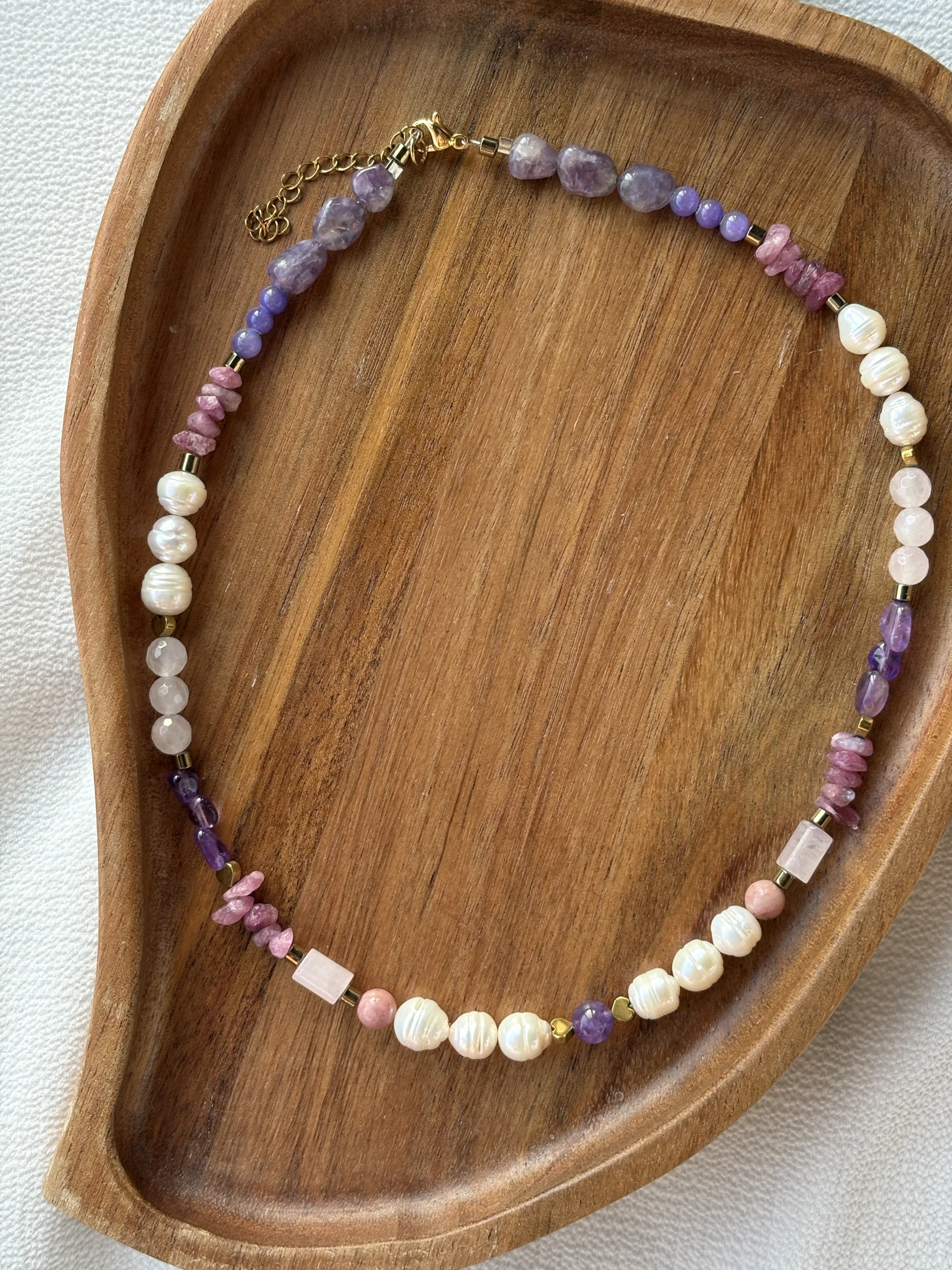 Conține: ametist, turmalină, jad, cuarț roz, perle de cultură, hematite și rodonite, elemente închidere oțel inoxidabil.